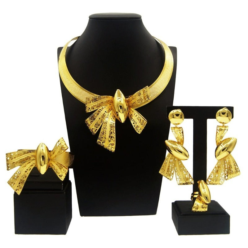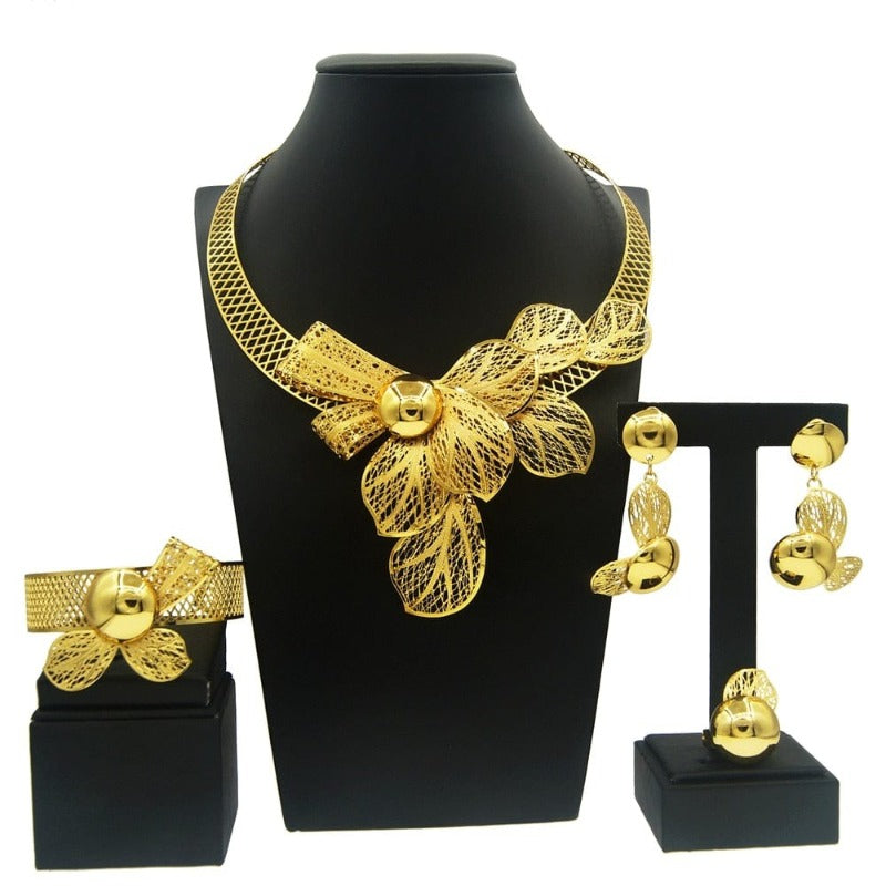Nom: Collier Pour Femmes Dubai Gold Tone Ensemble de Bijoux Plaqué 24K Original Boucles D'oreilles Bagues Bracelets Cadeaux De Mariage Livraison Gratuite Nigeria