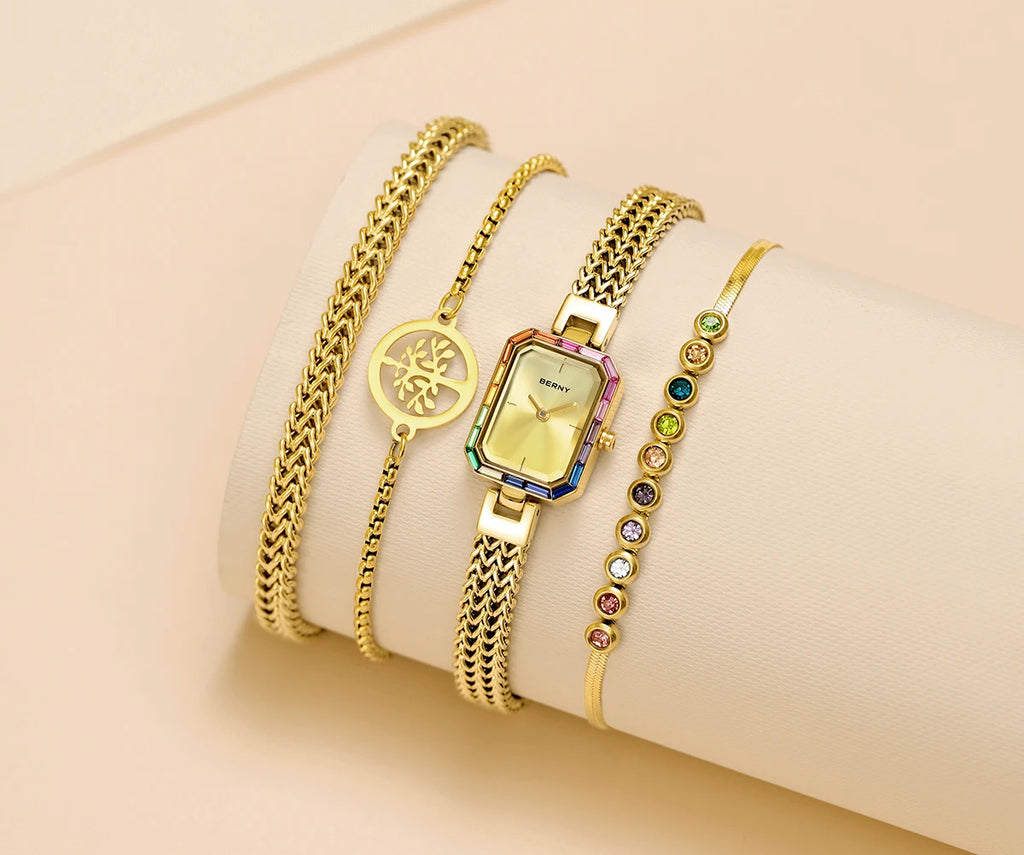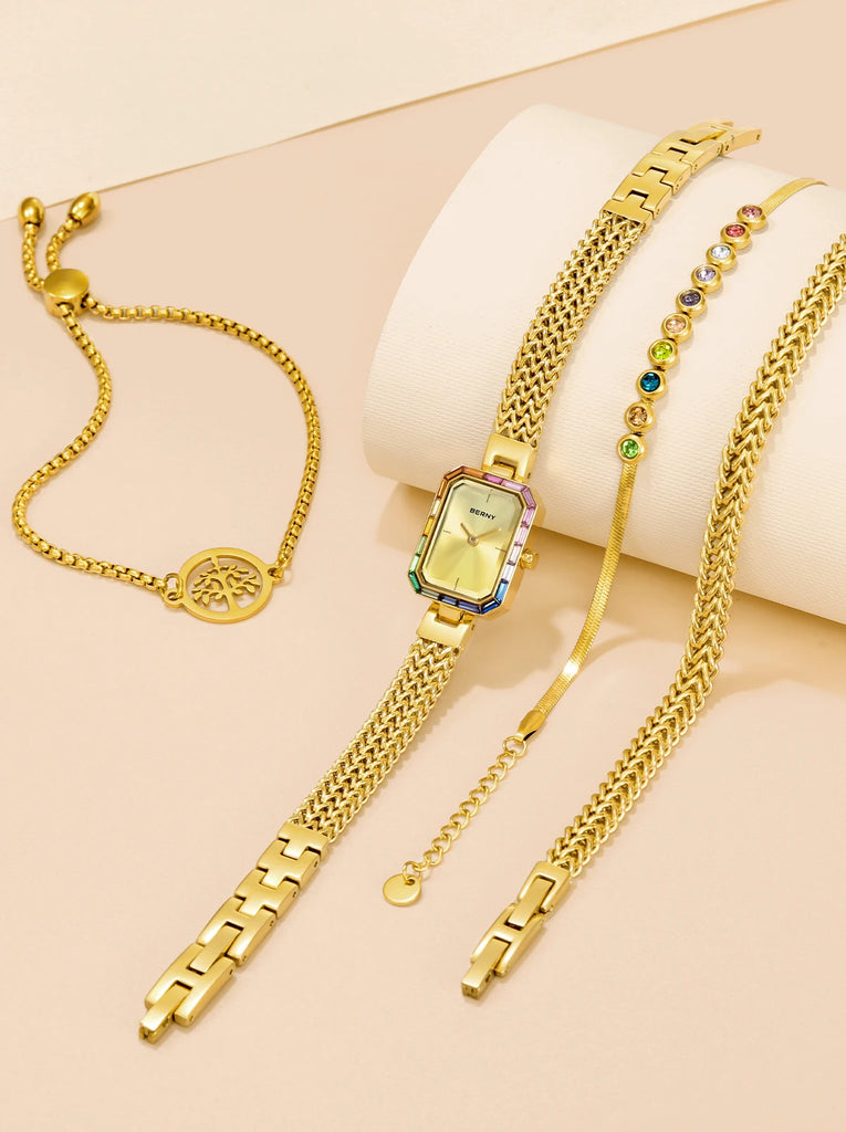 Découvrez un ensemble d’exception composé d’une montre rectangulaire pour femme et de trois bracelets assortis.
