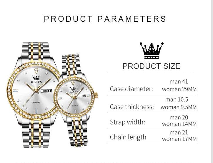 Chaque montre dispose d’un boîtier rond en acier inoxydable, robuste et durable, avec une épaisseur de 10,5 mm et un diamètre de cadran de 41 mm, offrant une présence élégante au poignet. La lunette incrustée de zircon apporte une touche luxueuse et raffinée, parfaite pour les couples qui veulent briller ensemble. Le bracelet en acier inoxydable de 21 cm de long et 20 mm de large assure confort et style.